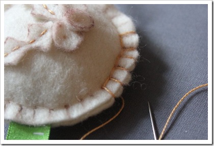 Then sew your holly shapes onto your top piece with the caramel Perle thread …